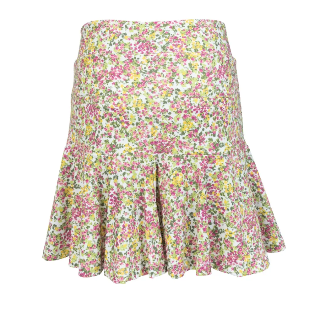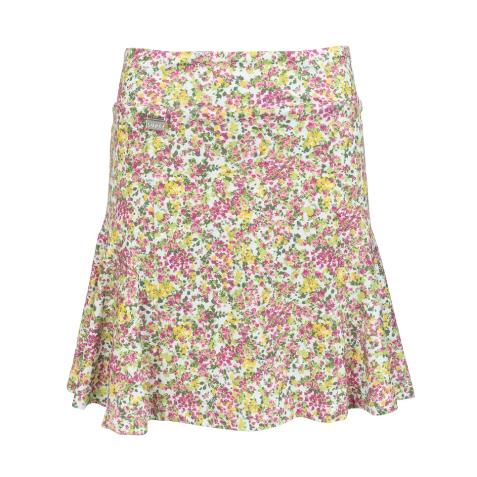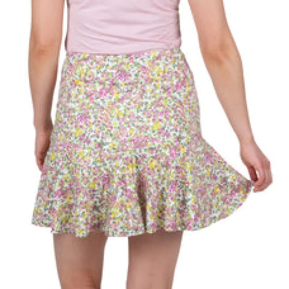 This 17” pull-on skort features front tee pockets and back slit pockets. It uses a beautiful printed polyester/spandex jersey blend – comfortable and versatile for your game. You’ll barely feel the lightweight undershorts, giving you a fantastic range of motion as you play. Using DeLux Dri™ Moisture Wicking Technology, the fabric will keep you cool and dry from the first tee to the final green. The Bloom Flip Skort pairs excellently with our single-coloured golf tops.