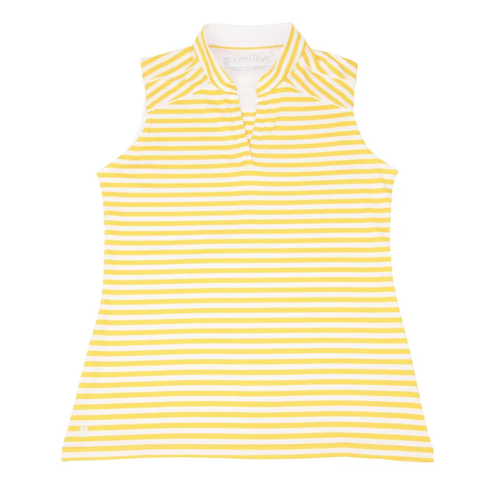 Fairways by Nancy Lopez is tailor-made for a hole-in-one performance. The Bold Sleeveless Polo, made with a 92% polyester and 8% spandex blend, features a lightweight, striped jersey fabric with DeLux Dri‚Ñ¢ moisture-wicking technology, keeping you dry and odour-free throughout your game. Its self-mandarin collar and open V-neck attractively frames the golfer with fitted comfort and poise as she makes putting look effortless. This polo is essential for any golf wardrobe, leaving you sleek and shaped for year-round swings.
