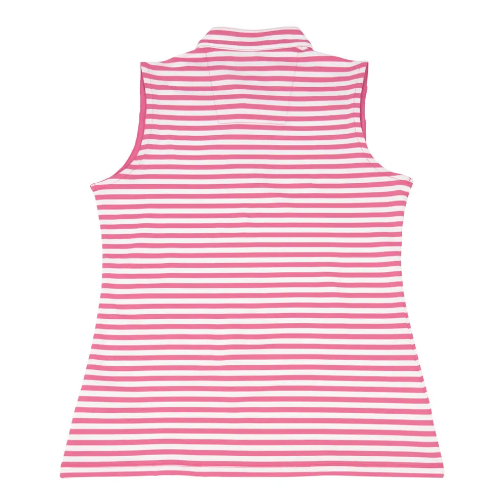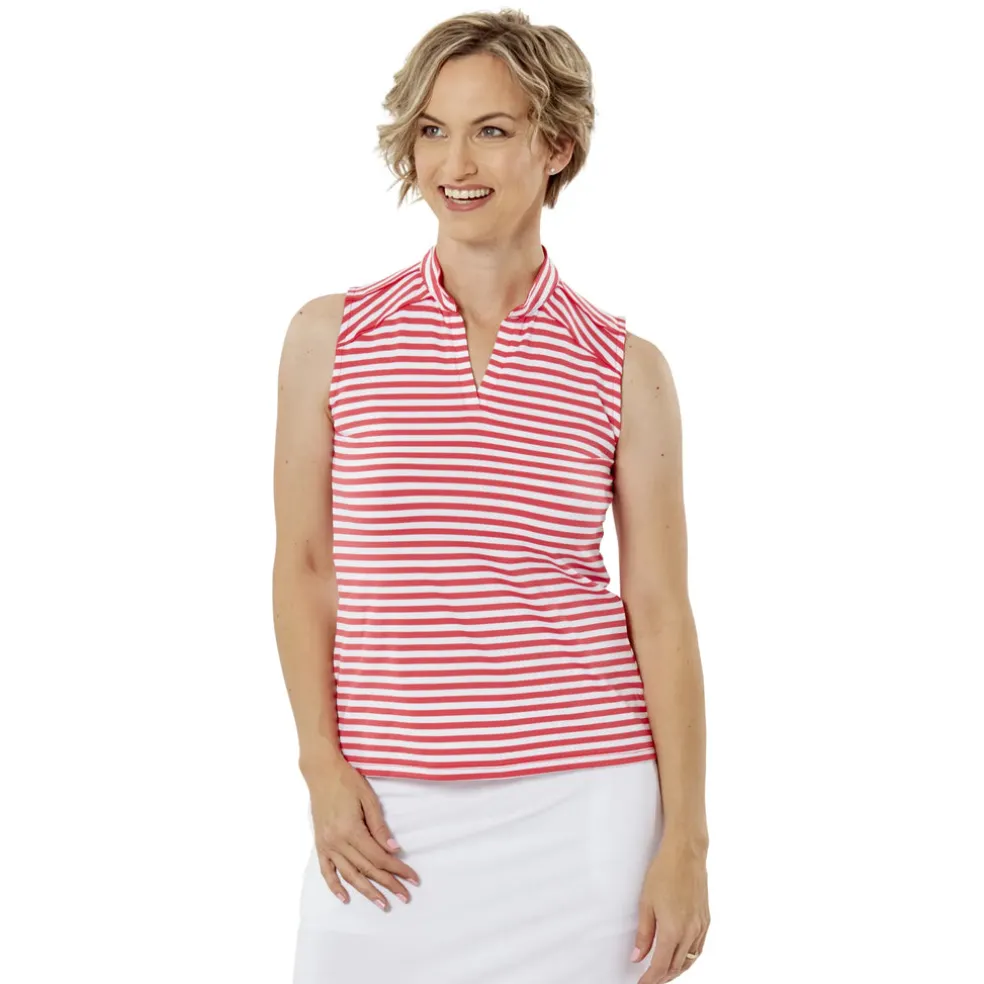 Fairways by Nancy Lopez is tailor-made for a hole-in-one performance. The Bold Sleeveless Polo, made with a 92% polyester and 8% spandex blend, features a lightweight, striped jersey fabric with DeLux Dri‚Ñ¢ moisture-wicking technology, keeping you dry and odour-free throughout your game. Its self-mandarin collar and open V-neck attractively frames the golfer with fitted comfort and poise as she makes putting look effortless. This polo is essential for any golf wardrobe, leaving you sleek and shaped for year-round swings.