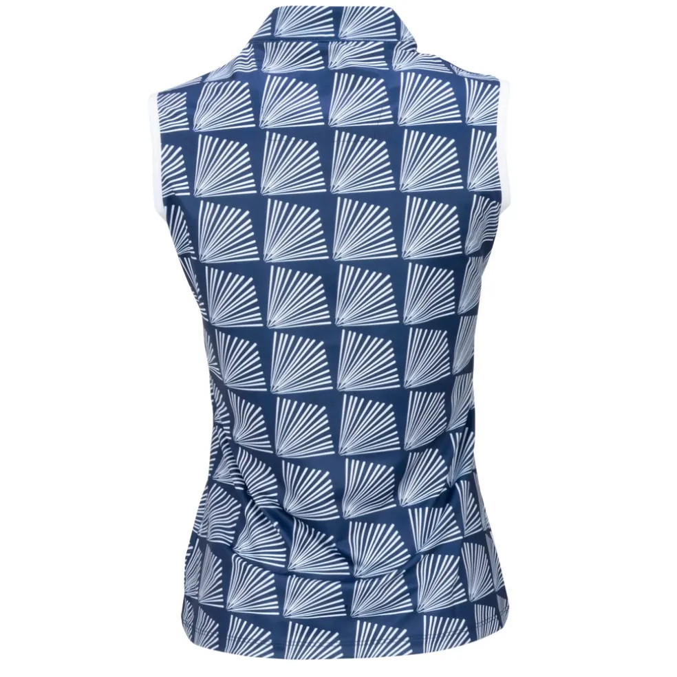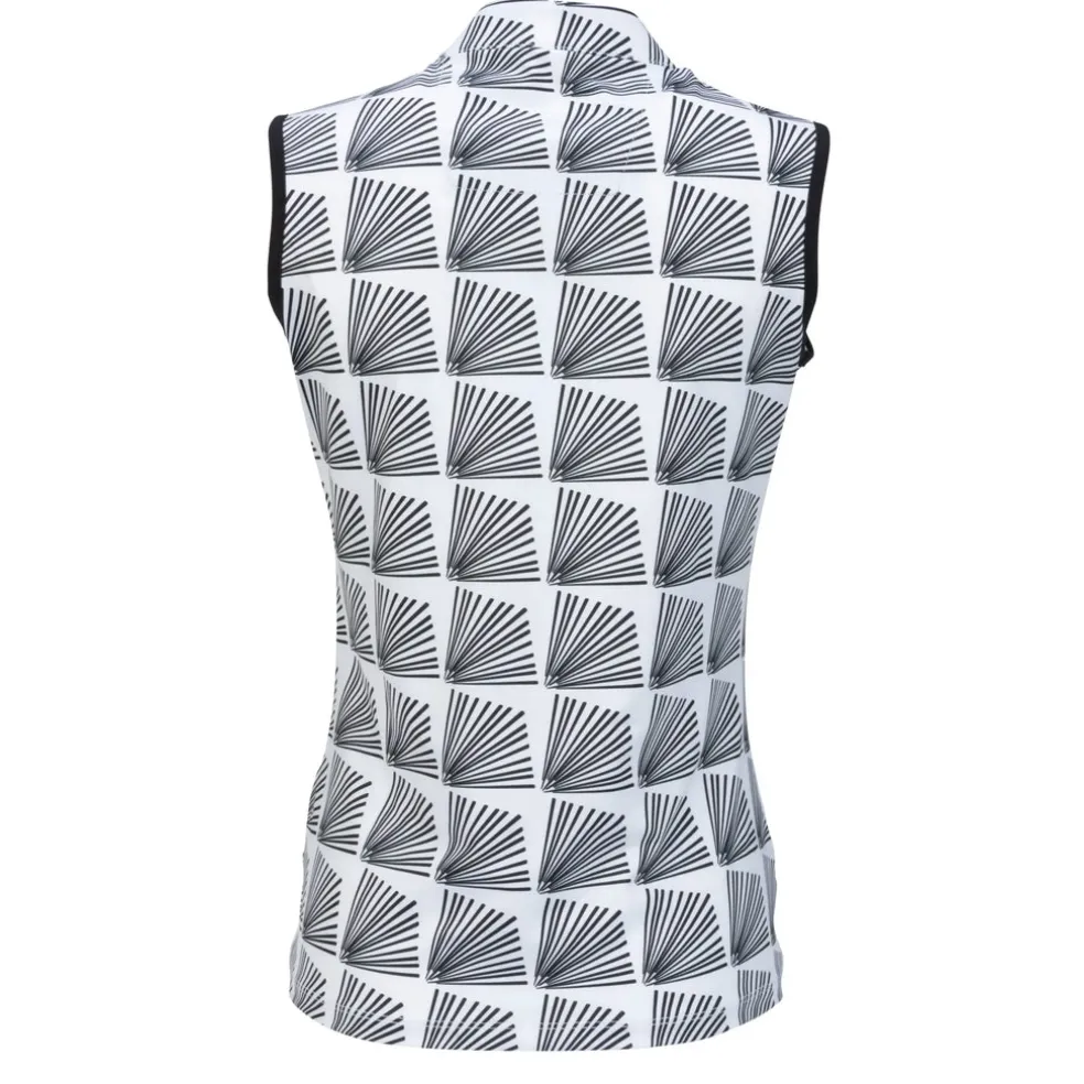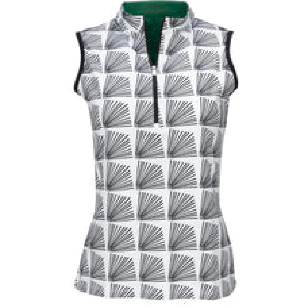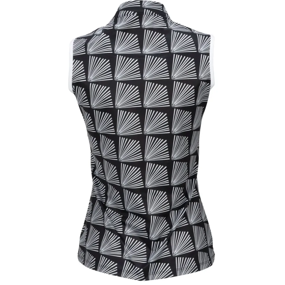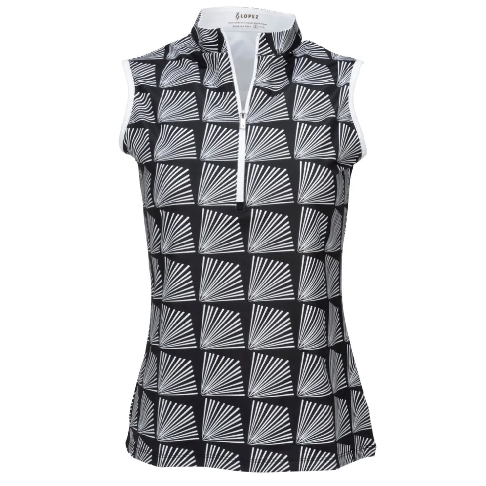 The Fanny Sleeveless Polo is constructed from a beautiful printed jersey made from a 90% polyester/10% spandex blend that is soft on the skin, yet cool to the touch. The mock collar, contrast zip placket with metallic jewel zipper pull and contrast sleeve trim offer an attractive, sleek neckline for the female golfer. Using DeLux Dri‚Ñ¢ Moisture Wicking Technology, the lightweight jersey fabric will keep you cool and dry from the first tee to the final green. With the signature Lopez Flame at the right hip, this polo is the perfect choice to pair with any single-coloured golf bottom.