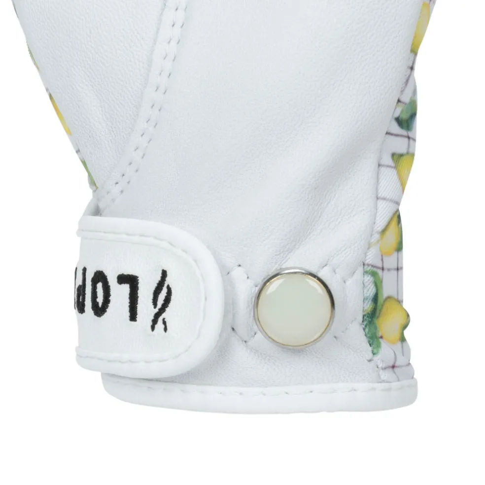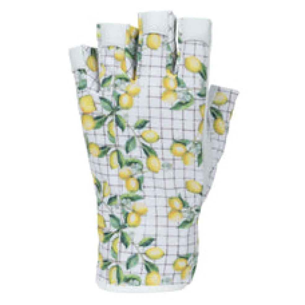 Take hold of your new records with style and poise in the Nancy Lopez Half Finger Tart Lemon Golf Glove. This sports glove is made with a lightweight, cool comfort stretch Spandex that allows the skin to stay cool and dry for ultimate breathability and comfort. Its soft, premium sheepskin Cabretta leather palm ensures a soft, comfortable feel and a consistent, durable grip with every swing. The UV 50+ sun protection fabrics provide the ultimate coverage and protection from the sun’s harmful UV rays out on the course. Available in a range of vibrant colours and signature prints, this glove tailors to your game performance.Left-hand gloves are for right-handed golfers. Right-hand gloves are for left-handed golfers.