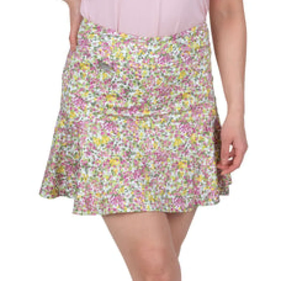 This 17” pull-on skort features front tee pockets and back slit pockets. It uses a beautiful printed polyester/spandex jersey blend – comfortable and versatile for your game. You’ll barely feel the lightweight undershorts, giving you a fantastic range of motion as you play. Using DeLux Dri™ Moisture Wicking Technology, the fabric will keep you cool and dry from the first tee to the final green. The Bloom Flip Skort pairs excellently with our single-coloured golf tops.