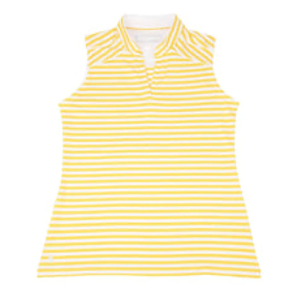 Fairways by Nancy Lopez is tailor-made for a hole-in-one performance. The Bold Sleeveless Polo, made with a 92% polyester and 8% spandex blend, features a lightweight, striped jersey fabric with DeLux Dri‚Ñ¢ moisture-wicking technology, keeping you dry and odour-free throughout your game. Its self-mandarin collar and open V-neck attractively frames the golfer with fitted comfort and poise as she makes putting look effortless. This polo is essential for any golf wardrobe, leaving you sleek and shaped for year-round swings.