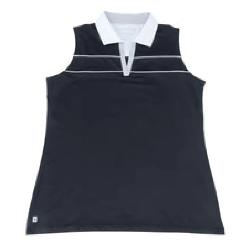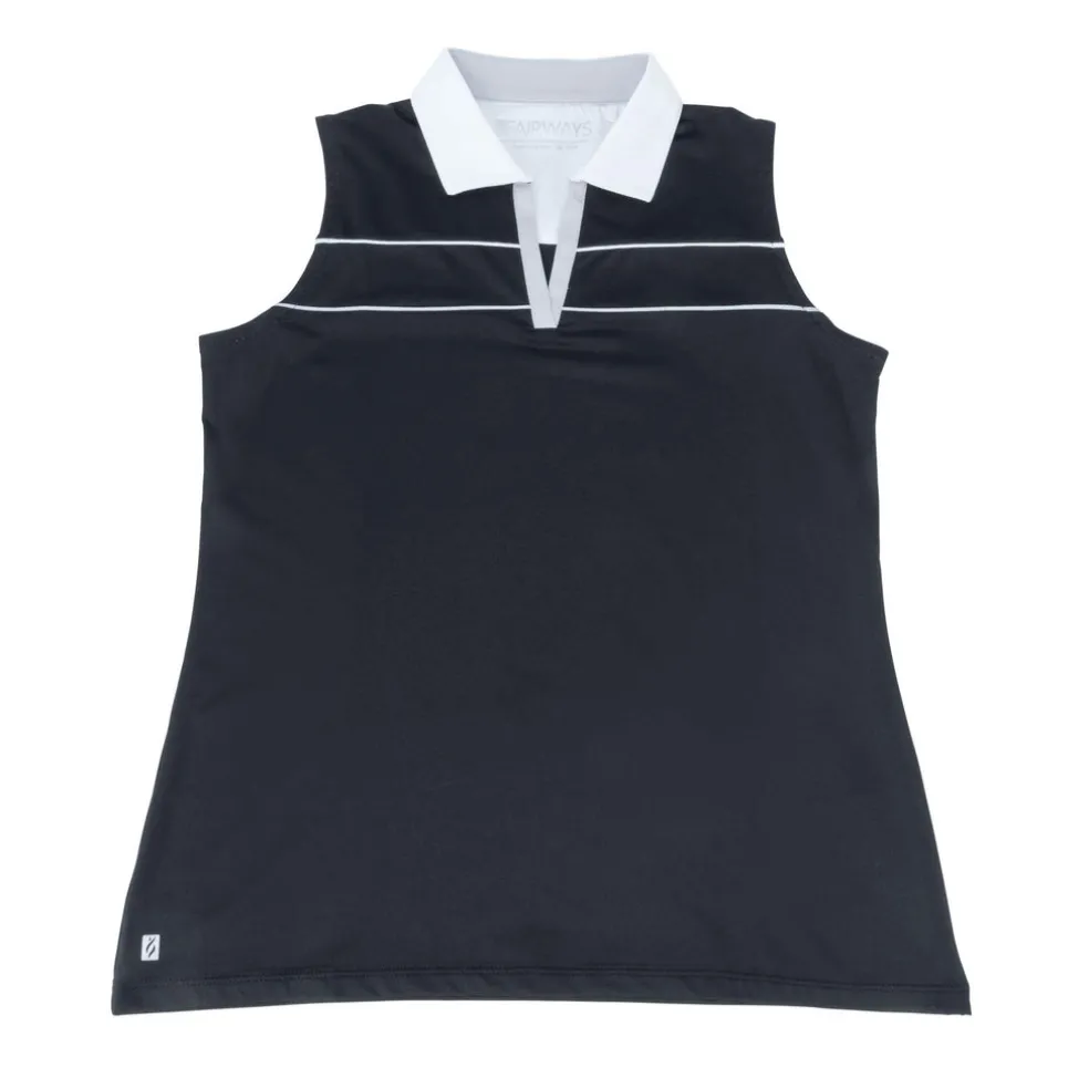 Fairways by Nancy Lopez is tailor-made for a hole-in-one performance. The Crush Sleeveless Polo, made with a 92% polyester and 8% spandex blend, features a lightweight, jersey fabric with DeLux Dri‚Ñ¢ moisture-wicking technology, keeping you dry and odour-free throughout your game. Its self-collar with open V-neck and contrast insets and piping attractively frame the golfer with fitted comfort and poise as she makes putting look effortless. This polo is essential for any golf wardrobe, leaving you sleek and shaped for year-round swings.