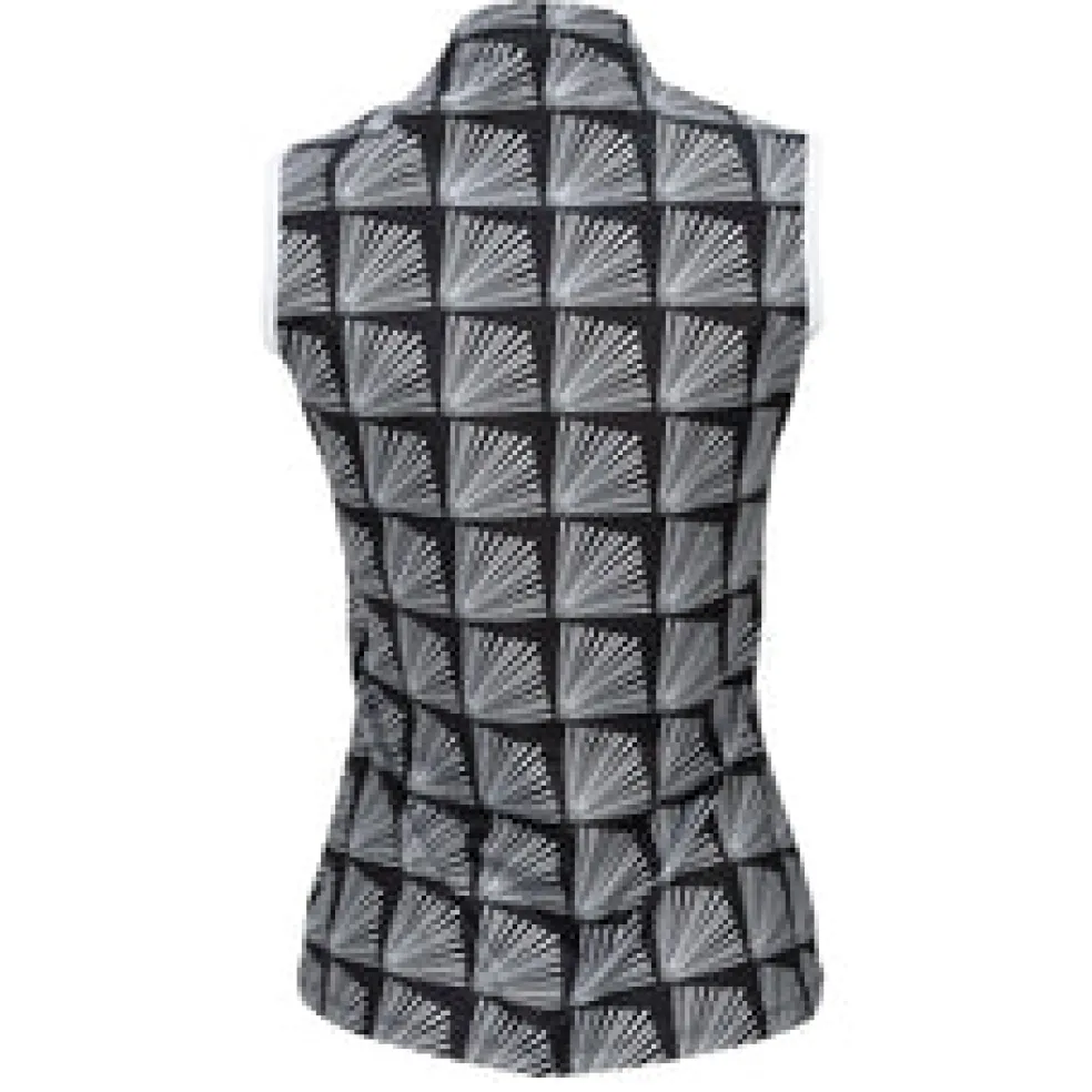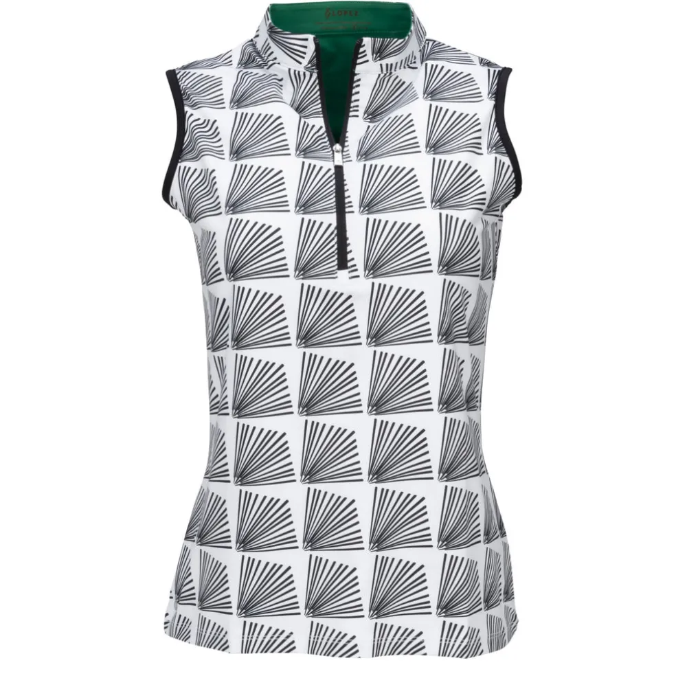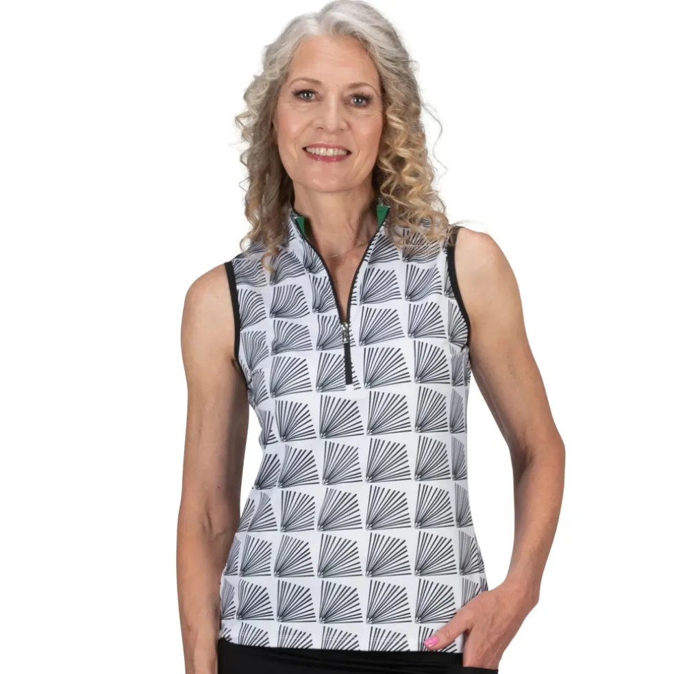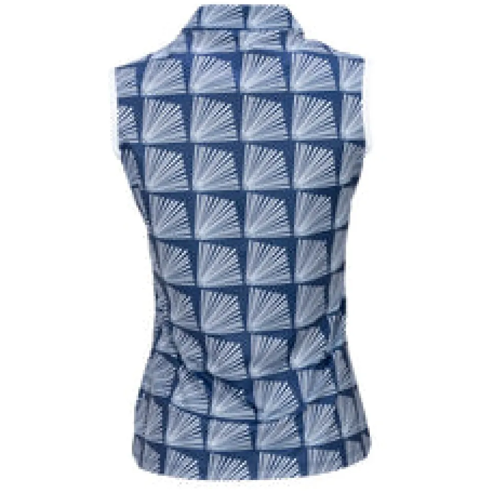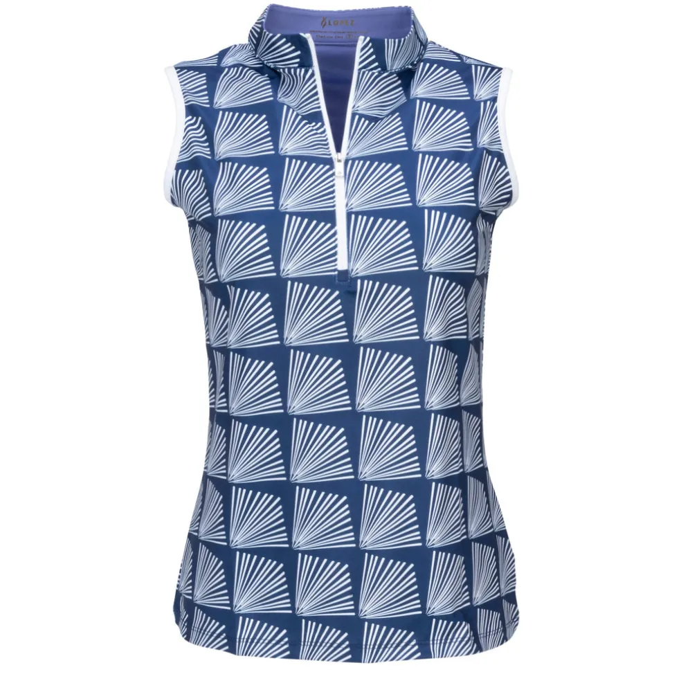 The Fanny Sleeveless Polo is constructed from a beautiful printed jersey made from a 90% polyester/10% spandex blend that is soft on the skin, yet cool to the touch. The mock collar, contrast zip placket with metallic jewel zipper pull and contrast sleeve trim offer an attractive, sleek neckline for the female golfer. Using DeLux Dri‚Ñ¢ Moisture Wicking Technology, the lightweight jersey fabric will keep you cool and dry from the first tee to the final green. With the signature Lopez Flame at the right hip, this polo is the perfect choice to pair with any single-coloured golf bottom.