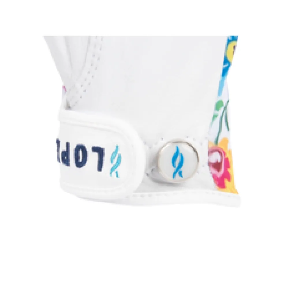 Take hold of your new records with style and poise in the Nancy Lopez Half Finger Beauty Golf Glove. This sports glove is made with a lightweight, cool comfort stretch spandex that allows the skin to stay cool and dry, for ultimate breathability and comfort. Its soft, premium sheepskin cabretta leather palm ensures a soft, comfortable feel and a consistent, durable grip with every swing. The UV¬†50+ sun protection fabrics provide the ultimate coverage and protection from the sun’s harmful UV¬†rays out on the course. Available in a range of vibrant colours and signature prints, this glove tailors to your game performance. Left hand gloves are for right-handed golfers. Right hand gloves are for left-handed golfers.