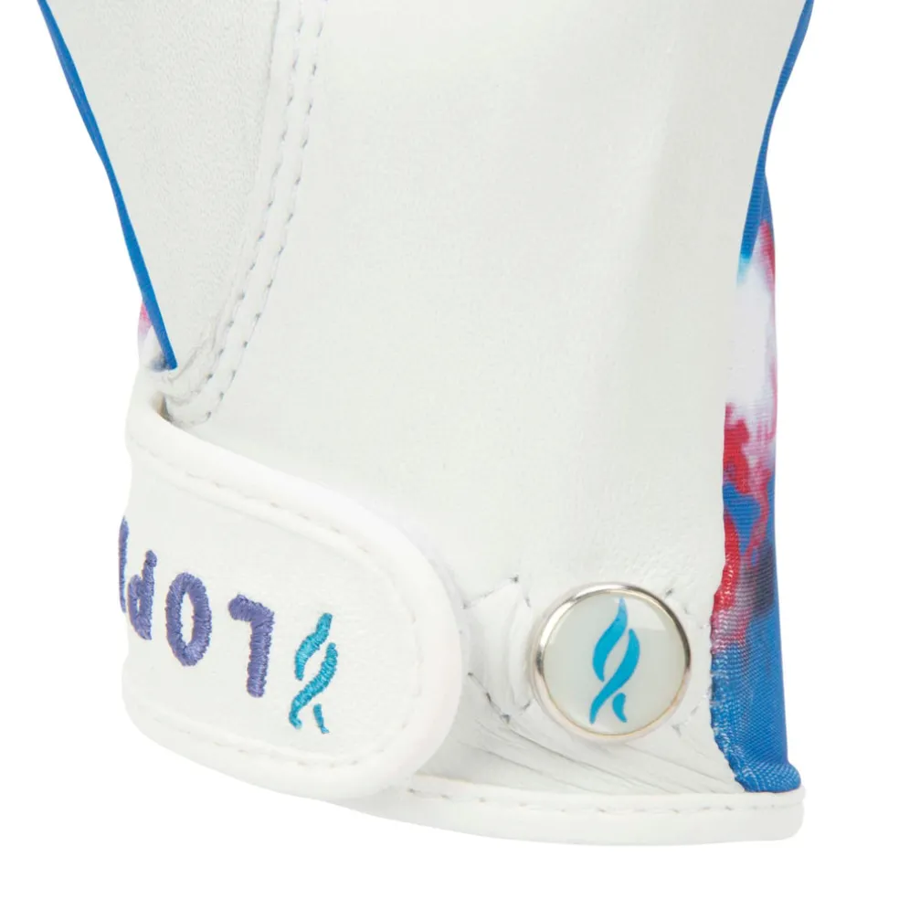 Take hold of your new records with style and poise in the Nancy Lopez Half Finger Groovy Golf Glove. This sports glove is made with a lightweight, cool comfort stretch spandex that allows the skin to stay cool and dry, for ultimate breathability and comfort. Its soft, premium sheepskin cabretta leather palm ensures a soft, comfortable feel and a consistent, durable grip with every swing. The¬†UV¬†50+ sun protection fabrics provide the ultimate coverage and protection from the sun’s harmful¬†UV rays out on the course. Available in a range of vibrant colours and signature prints, this glove tailors to your game performance. Left-hand gloves are for right-handed golfers. Right-hand gloves are for left-handed golfers.