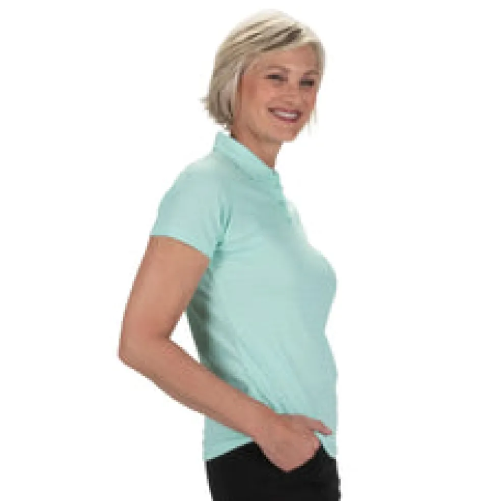 The Journey Short Sleeve Polo is constructed from a beautiful jacquard fabric made from a polyester/spandex blend that is soft on the skin yet cool to the touch. The attractive self-fabric collar and 4-button placket offer a sleek neckline for the female golfer. Using DeLux Dri‚Ñ¢ Moisture Wicking Technology and UPF 50+, the fabrics will keep you dry and sun-protected from the first tee to the final green. This polo is perfect for pairing with any single-coloured or printed golf bottom.
