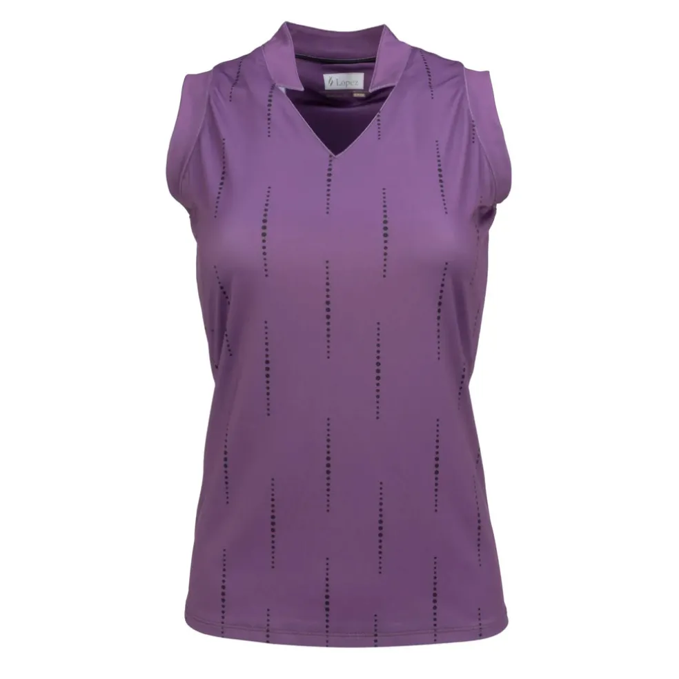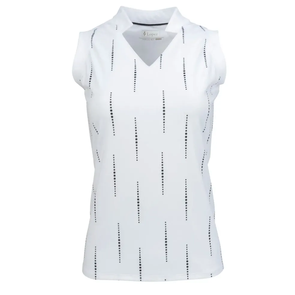 Elevate your game with the Sonic Sleeveless Polo, designed for style and performance. This polo, made from a high-performance polyester/spandex printed jersey fabric, features DeLux Dri‚Ñ¢ moisture-wicking technology and UPF50+ sun protection to keep you cool, dry, and protected on the course. The sophisticated mandarin collar with an open-V placket adds a modern touch, while the zero-point underarm detail prevents gaping for a flawless fit. Finished with the iconic Lopez Flame on the right hip, this polo combines functionality with elegant design, making it a standout choice for your golfing wardrobe.